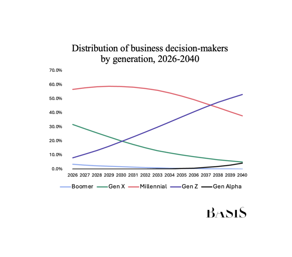 As things stand, Gen Z accounts for around 8% of influence in B2B buying decisions. That share is expected to double within the next three years. By 2031, there will be more Gen Z decision-makers in businesses than Gen X, and in just over a decade they will overtake Millennials as the main decision-making group.